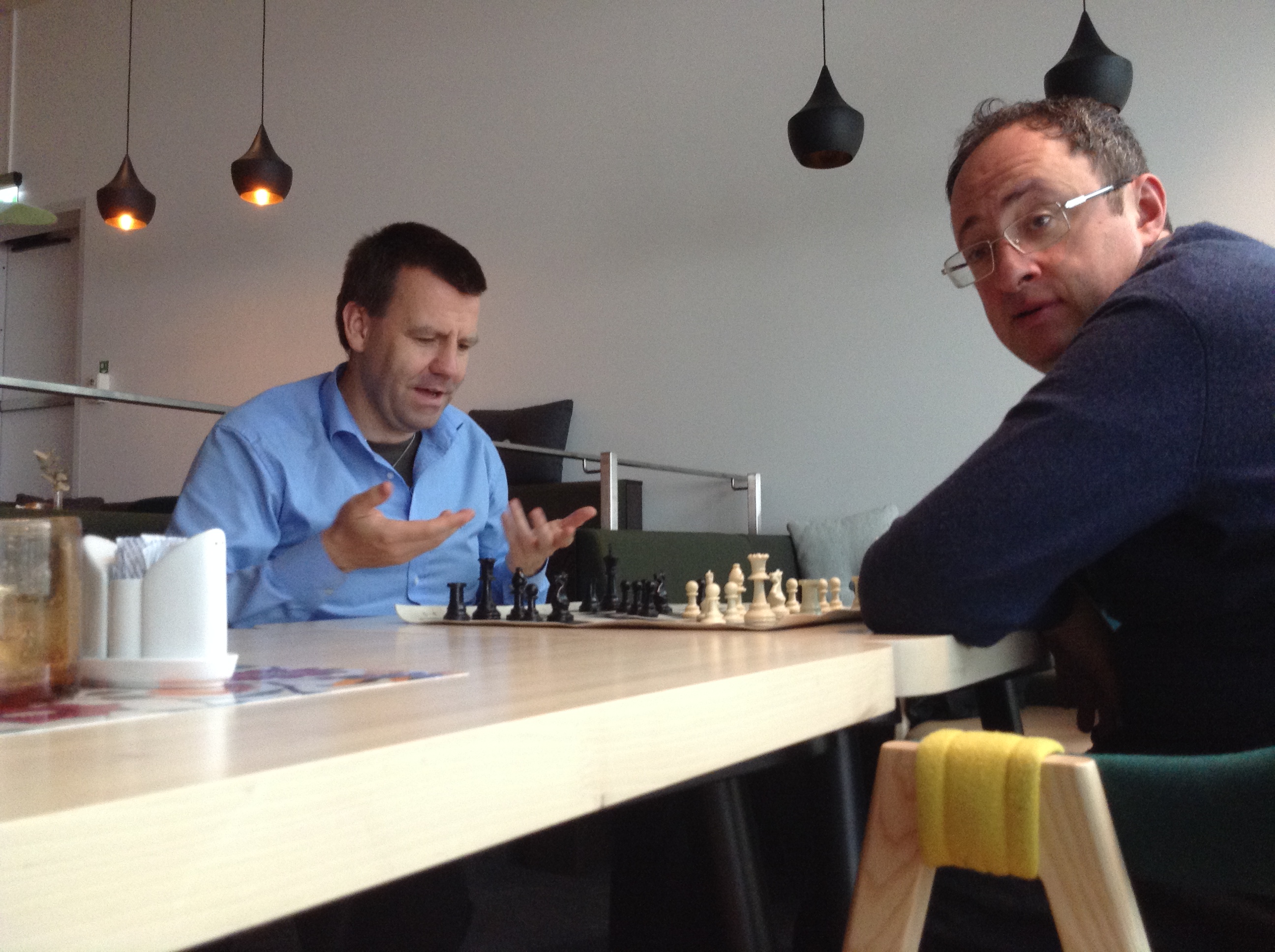 I went to visit a few friends on the Clarion Edge Hotel; the official hotel. It is where all the delegates stay. What can you deduce from this? No chess sets! So I asked Nikos to bring one…