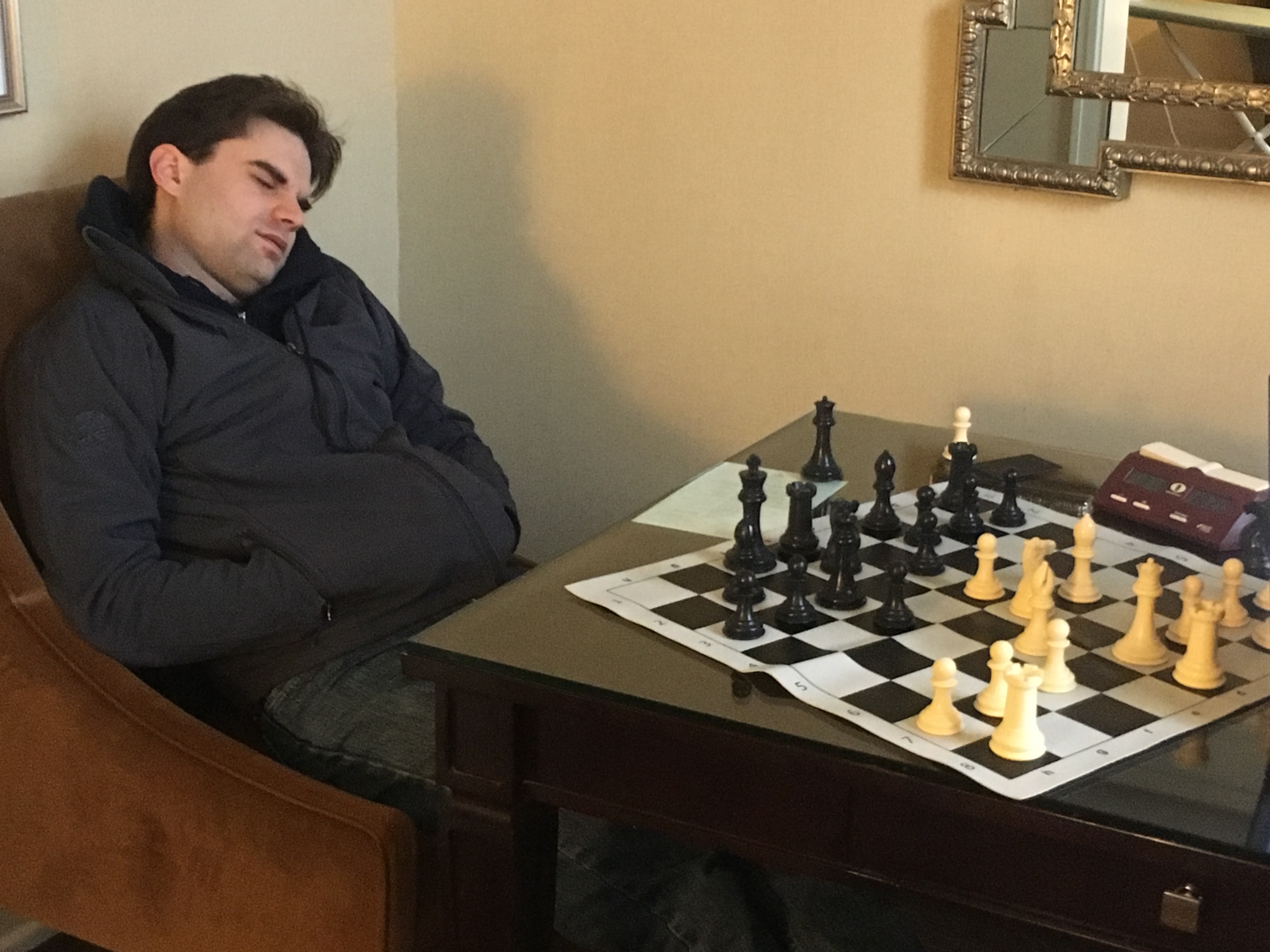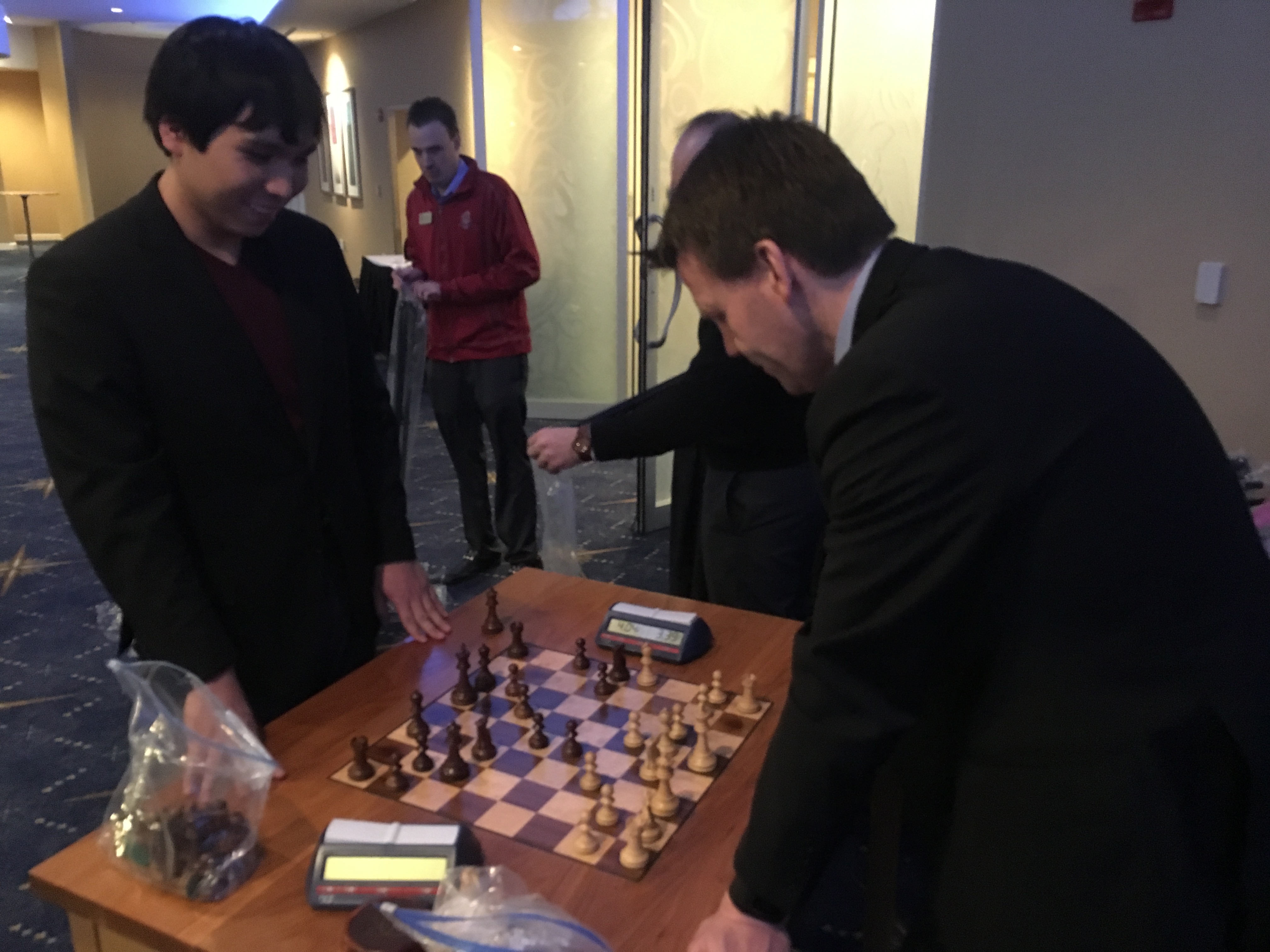 The main reason I was in St Louis was because the US Team was being honoured at a fundraiser for the St Louis Chess Club and Scholastic Center, or however their long complicated name goes… I was meant to be in California cracking the whip over Sam Shankland, but we had to do this in St Louis instead, where it was quite a bit colder than California! Still, we survived by baricading ourselves in the five star hotel. Here is Sam calculating…