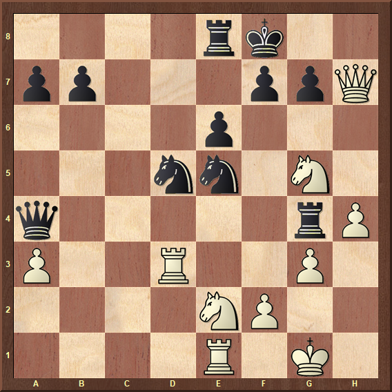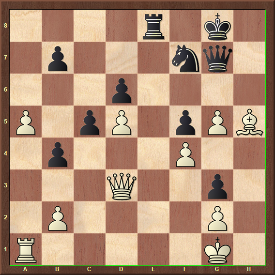Instead of retreating to f1 with the knight, Korobov took on g4. After 31.hxg4?? hxg3 32.g5 Amin realised that things had turned and he found 32…Qg7! and took over the initiative. Korobov lost control of the position and ended up in this mess.
