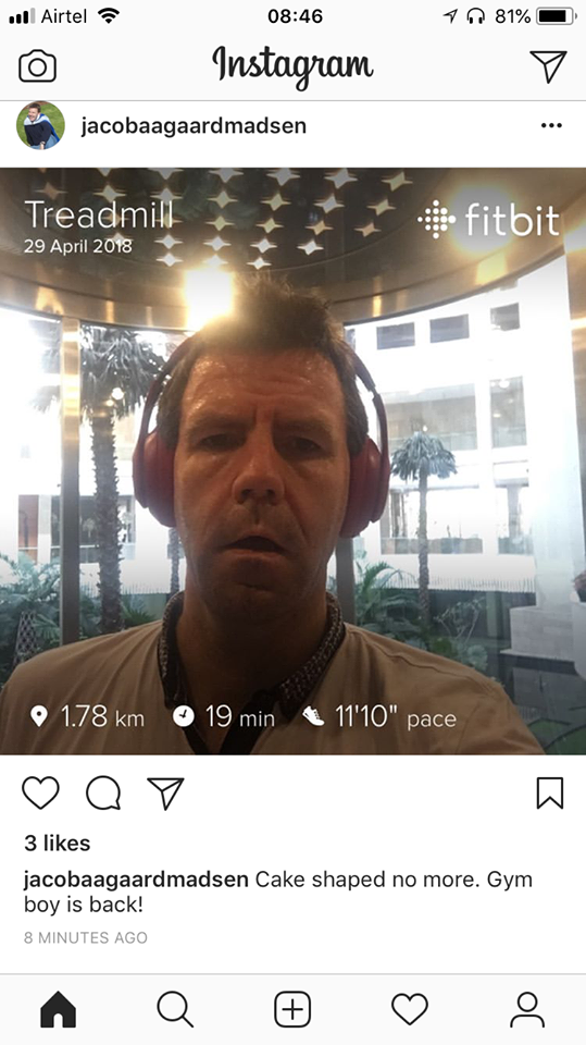 So here I am, post work-out. At the moment I am just happy I can breathe again. I go on the treadmill for 20 minutes, put it on 5% incline (yeah, getting back into shape is an uphill struggle) and walk for 5 minutes (6km/h), then 4 minutes at 9km/h, walk for 2 minutes, then 3 minutes at 10 km/h, walk for 2, and 2 minutes at 11 km/h, before walking for 2 minutes and feeling desperately thirsty.