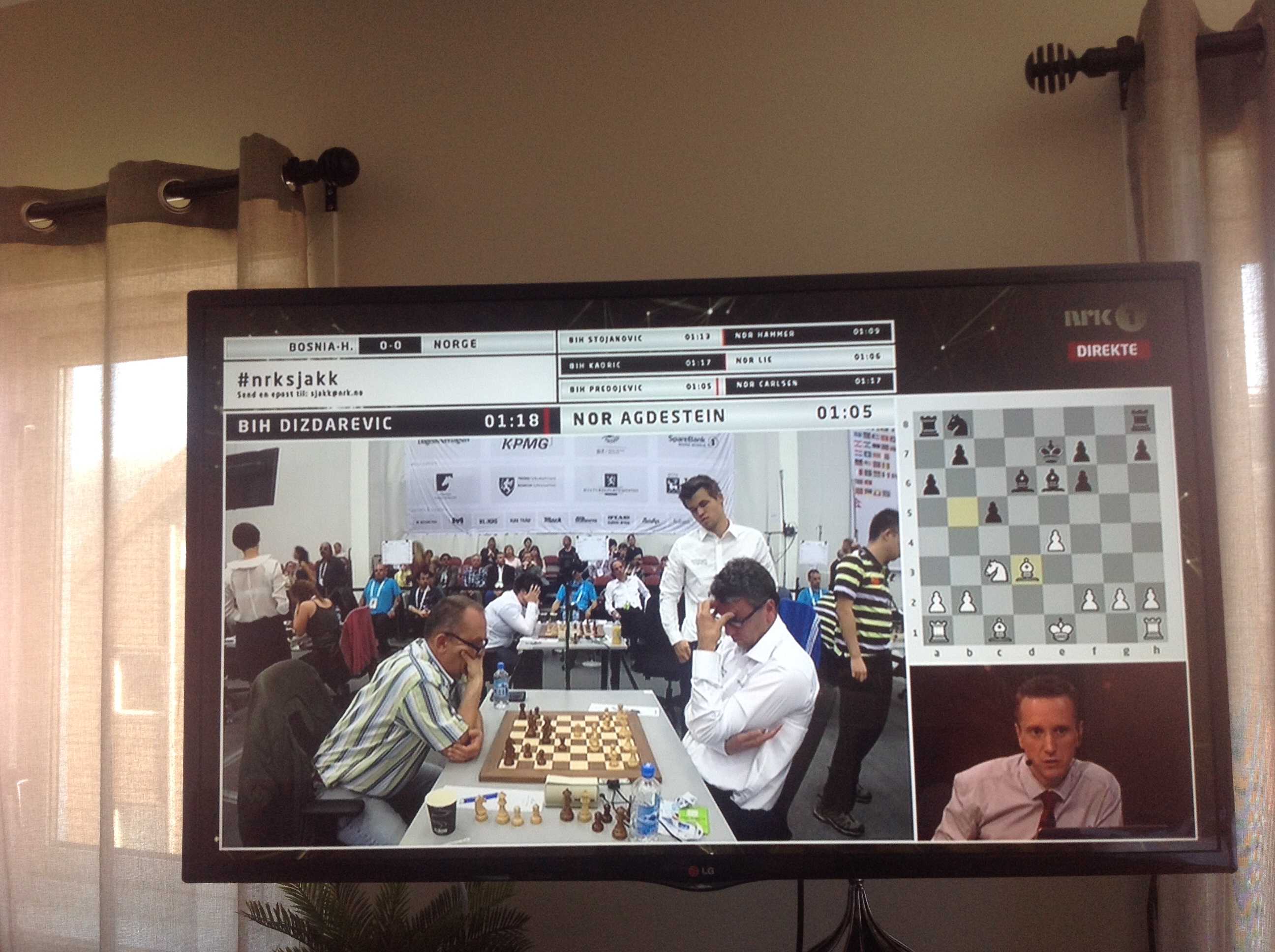 What’s the point? That is a snapshot of the five hours of live coverage the main Norwegian TV channel had of the Olympiad each day. Magnus Carlsen is watching his teammate Agdestein. Norway has gone chess mad, or maybe it’s Carlsenmania. If the BBC in the UK had five hours of live chess every day for over a week, there would be rioting in the streets.