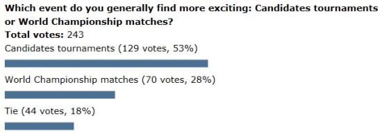Last week’s poll question led to a clear answer: the Candidates events are generally more exciting than World Championship matches.