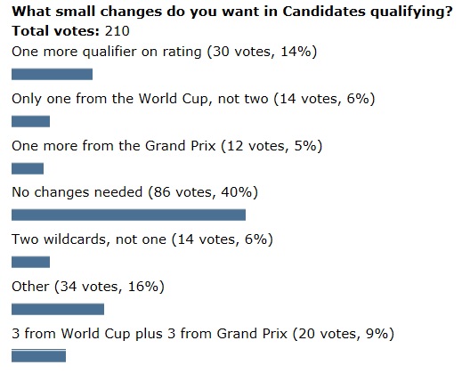 The current system is that 8 play in the Candidates: 2 qualify from the Grand Prix, 2 from the World Cup, 2 on rating, the loser of the last World Championship match, and 1 ‘wildcard’, which means the organizers can invite whoever the local hero is.
