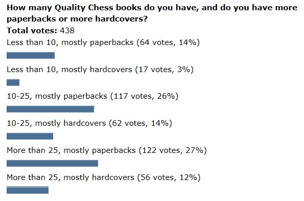 This week I’ll move on from asking for opinions to looking for facts. We’re interested in: How many Quality Chess books do you have, and do you have more paperbacks or more hardcovers?