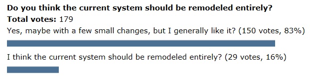Last week’s poll question was “Do you think the current system should be remodelled entirely?” There was an overwhelming 83% in favour of NOT remodelling the whole thing, despite Jacob’s attempt to trick you by starting the “No” answer with the word “Yes”.