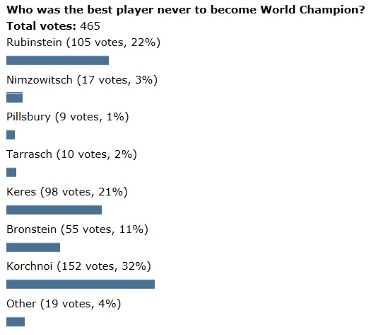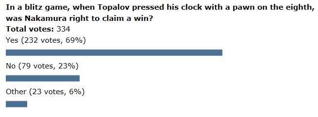 Last week’s question: ‘Was it right of Nakamura to claim the full point in the game against Topalov?’ 69% said Yes, and 23% No. The only surprise to me is that ‘No’ received so many votes. In competitive blitz, illegal moves lose. And push-a-pawn-to-the-8th-and press-the-clock is a blatantly illegal move.