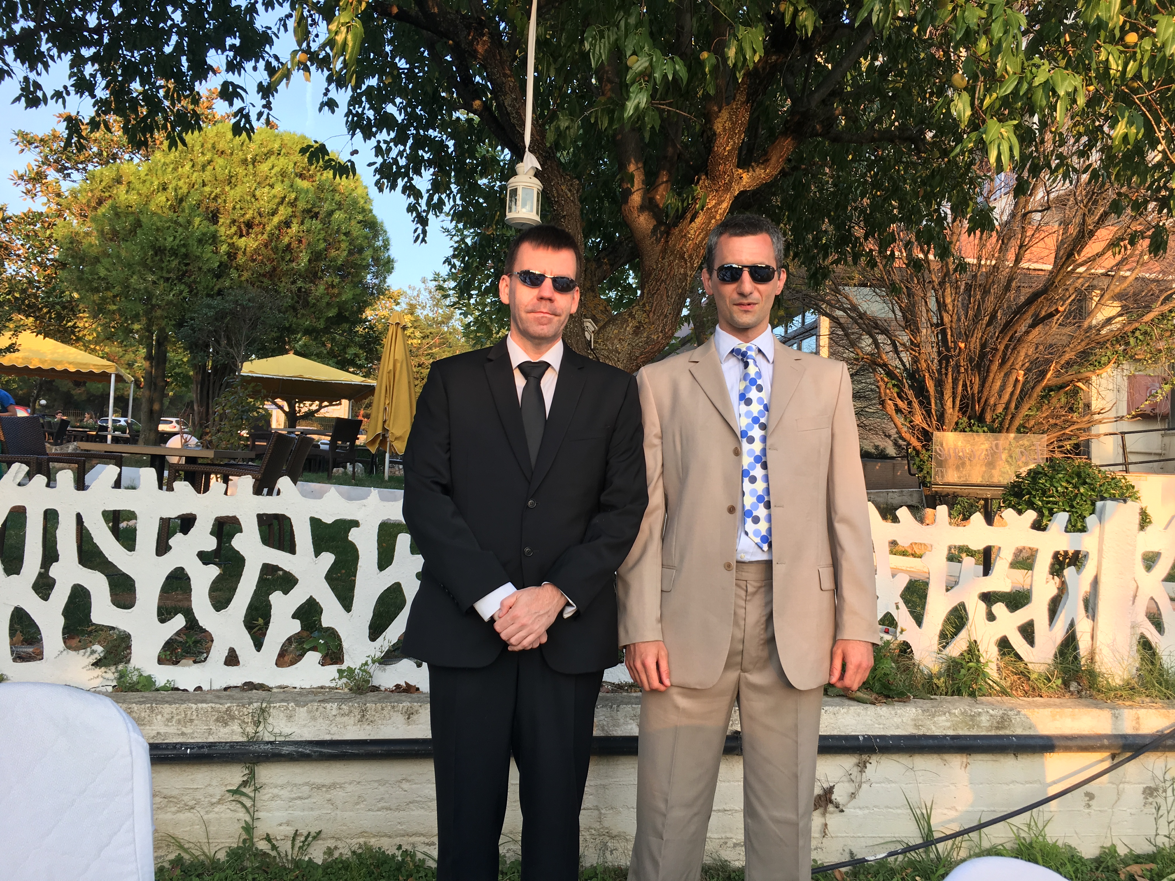 Jacob and I have just arrived back after five days in Thessaloniki, where we attended the wedding of our good friend (not to mention author) Nikos Ntirlis and his lovely bride Georgia. Below are a couple of photos from the wedding, where we also found time to audition for the roles of two agents in the next Matrix sequel.