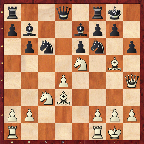 14…Bxf6 15.Qe4 g6 16. Nxc6 Qc7 17. d5 exd5 18. Nxd5 Qxc6 19. Nxf6+ Qxf6 20.Qxb7